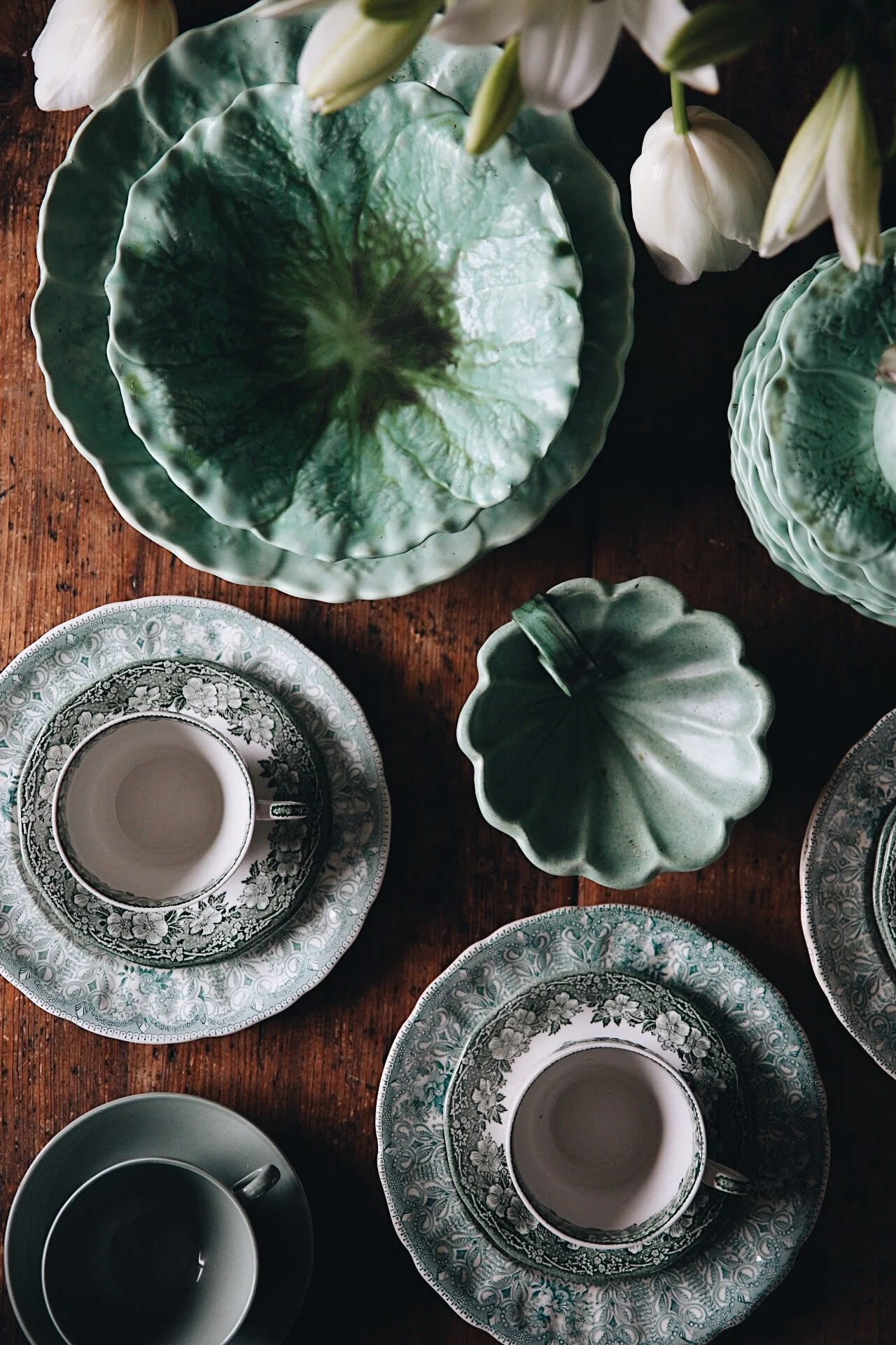 Fokus i denna bild är den lilla vasen och assietterna som den står på. Denna vackra serie kommer från Gefle Porslinsfabrik och heter “Kålblad” av keramikern Ruben Wallström. På bilden nedan ser du även uppläggningsfatet och två olika storlekar på skålar. Den här servisen gillar jag jättemycket. Inte minst till jordgubbarna på sommaren, men även till frukostmackan tillsammans med mina gröna stora koppar.