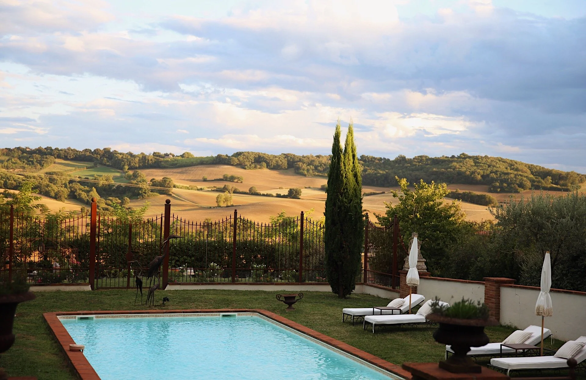 …..med en magnifik utsikt över saltvatten-poolen och det böljande landskapet. Risken är att man blir sittandes i timmar! Men vad gör det. Bodil och Petris önskan är att detta skall vara en plast där man kan sänka axlarna och bara vara. Jag kan intyga att de lyckats!