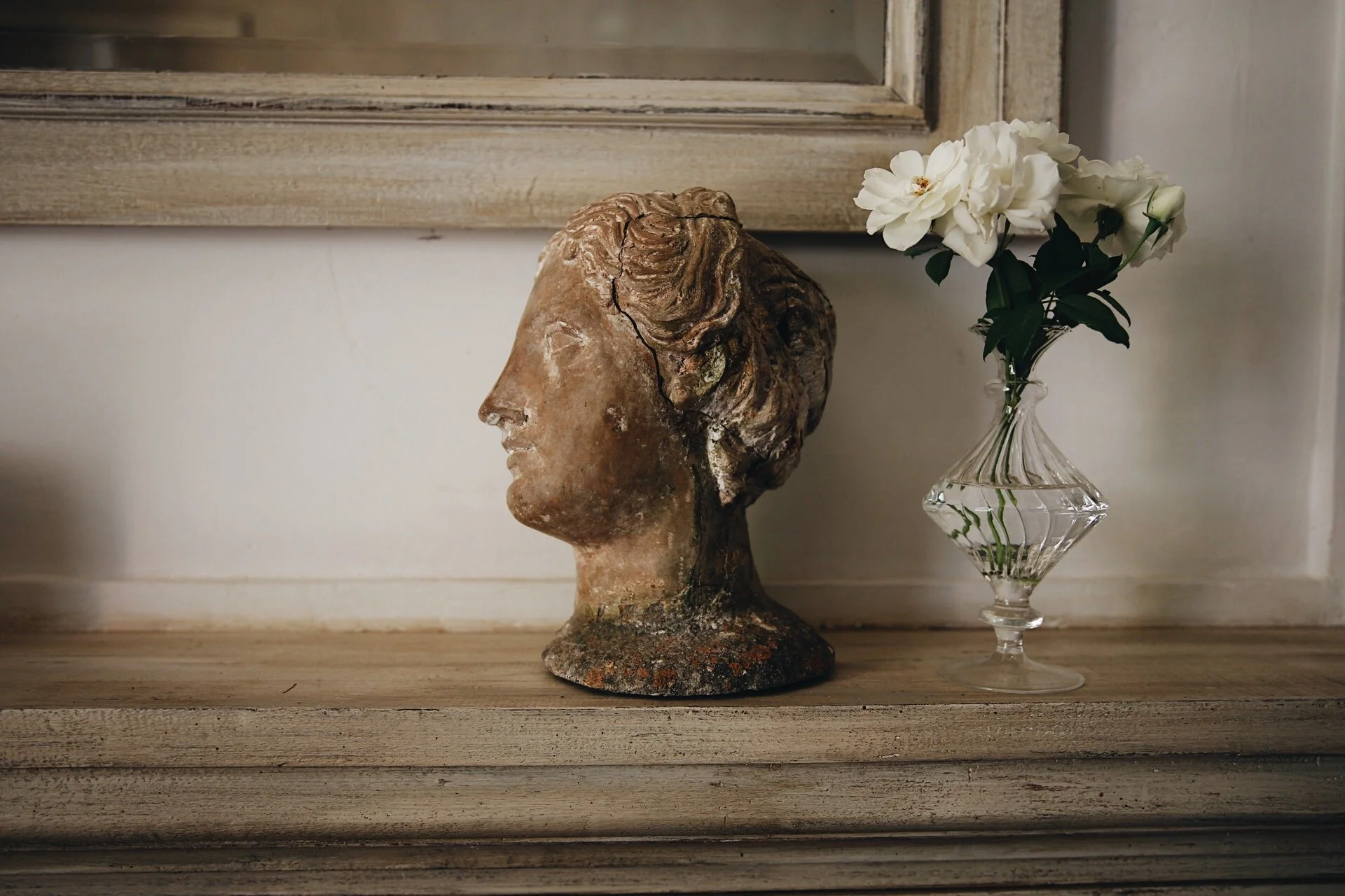 Även inomhus är det lätt att hitta en egen vrå att dra sig undan till. Inne i biblioteket, med en enorm bokhylla utmed ena väggen, finns det soffor att krypa upp i, precis som i rummet bredvid, med den stora öppna spisen. Där ett vackert huvud på spiselkransen, trängs med färska rosor från trädgården.