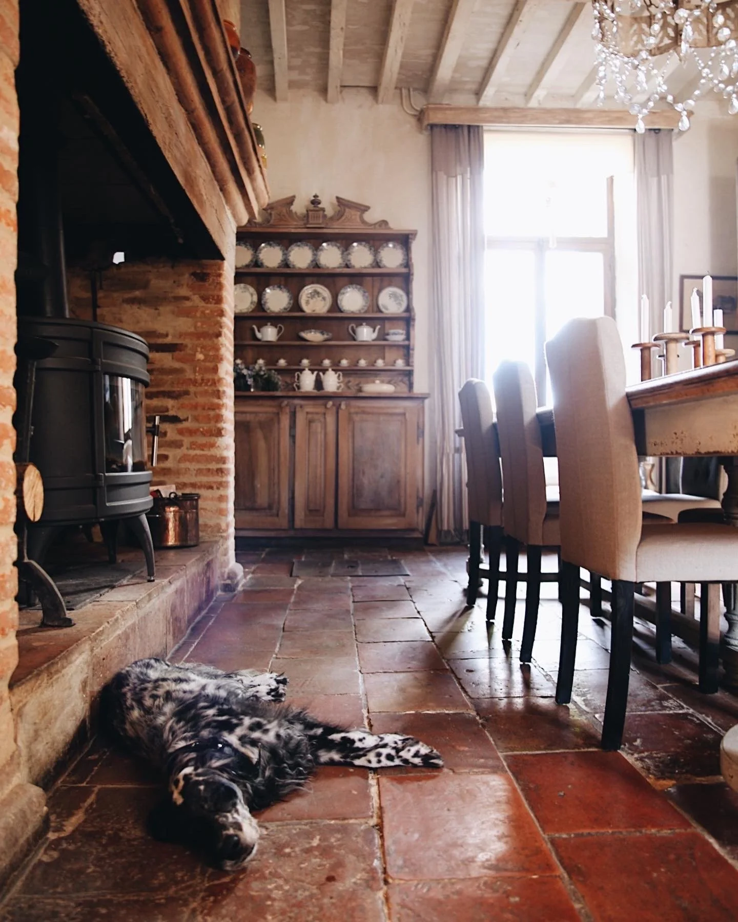 Här i det flera hundra år gamla lantköket trivs både människor och hundar. Det är även här som frukosten dukas upp på den murade bänken. Mer om köket i ett eget inlägg. Det krävs minsann.
