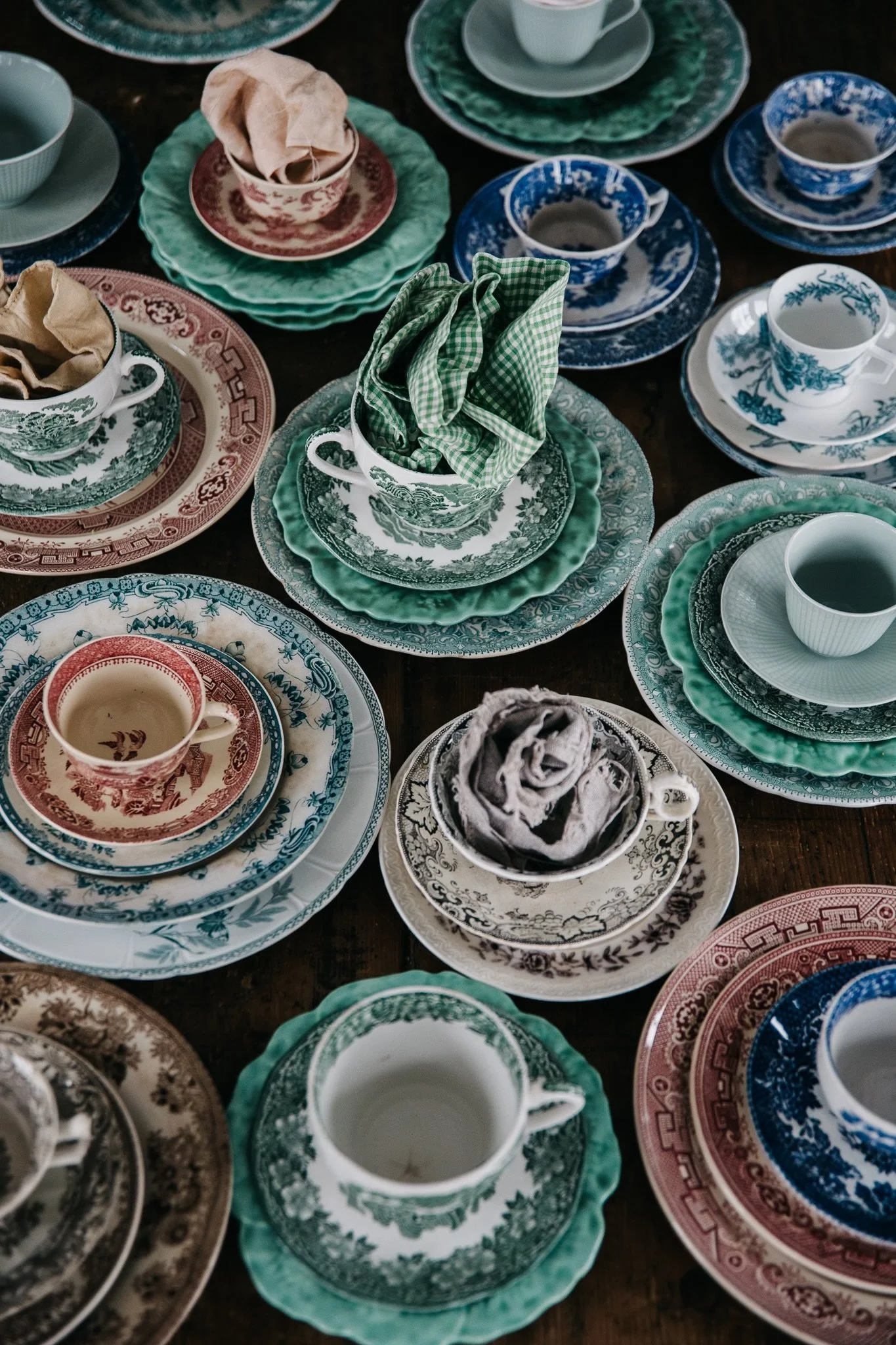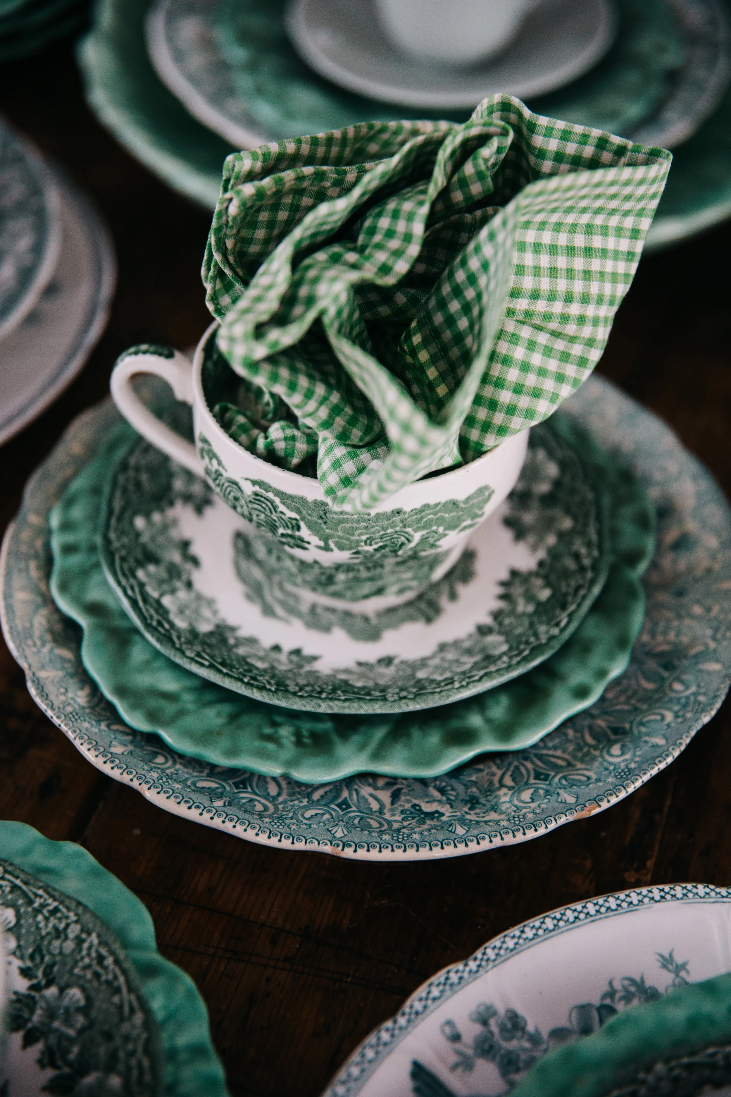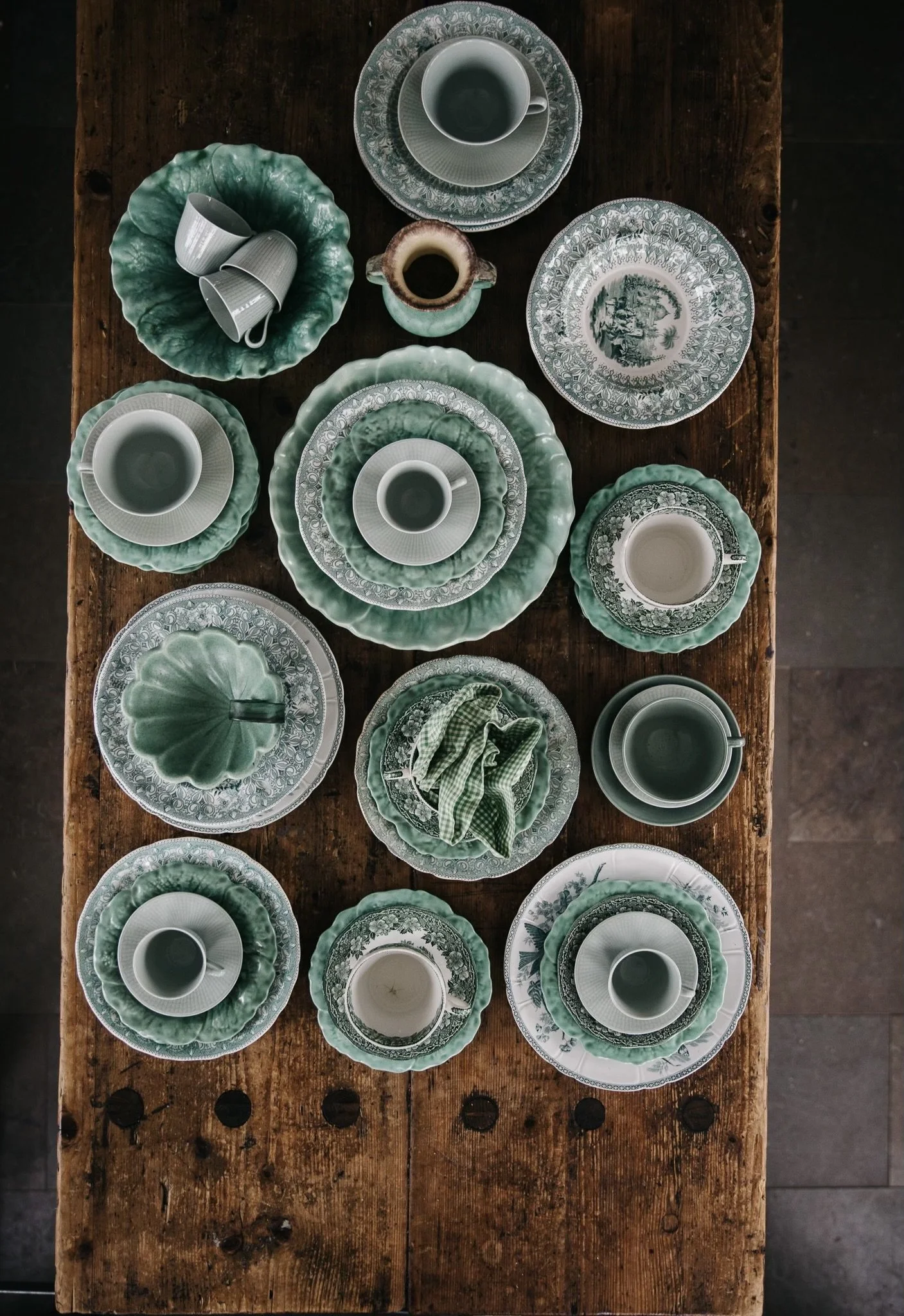 De grönmönstrade kaffekopparna är av märket Old English. Assietten under är ”Kålblad” från Gefle designad av Ruben Wallström.