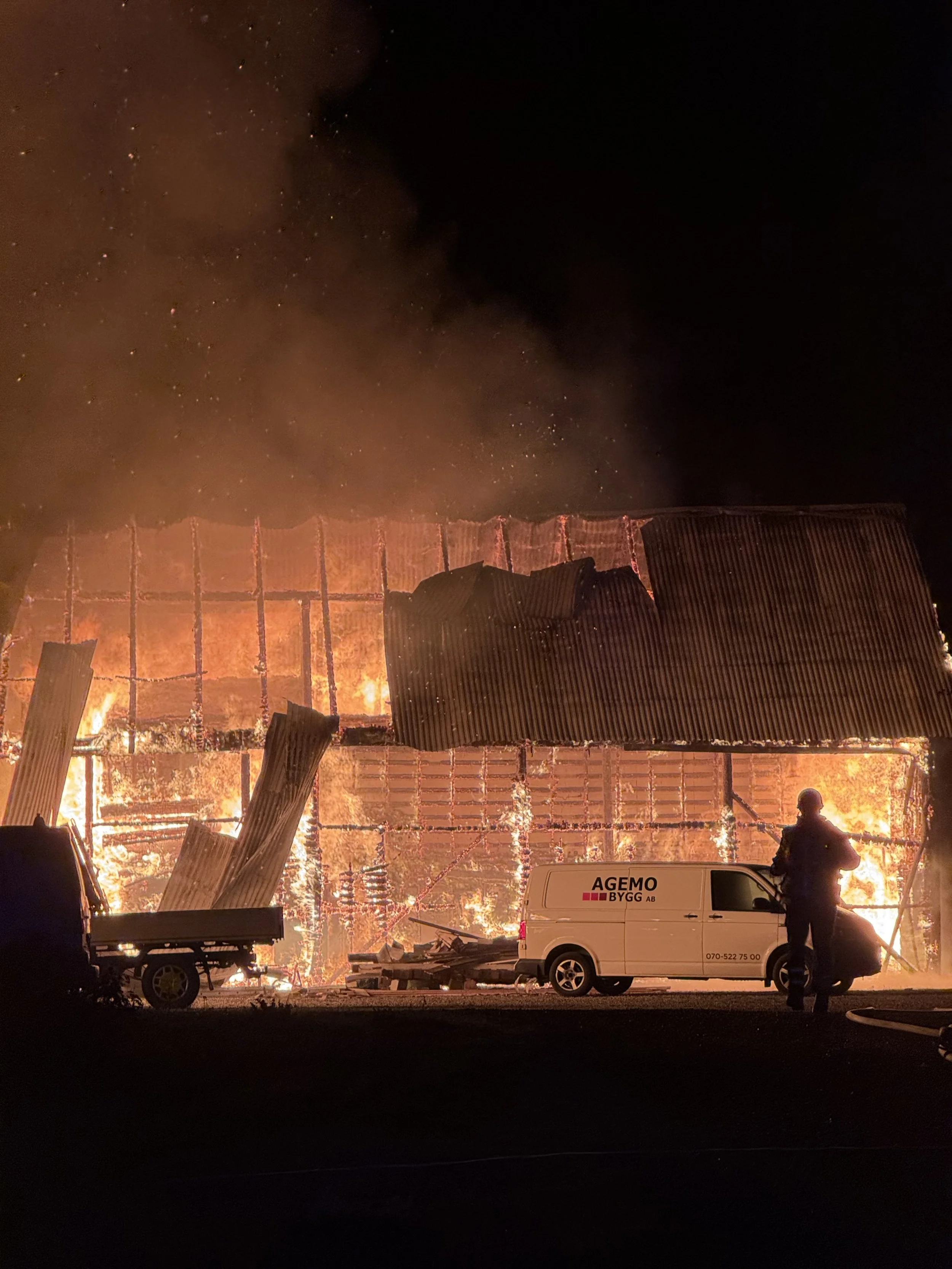 Den första av fyra brandkårer är på plats ca 15 minuter efter att vi larmat. Då är ALLT helt övertänt och vi får veta att ”inget går att rädda, och att man kommer låta det brinna ned till grunden. Vi kommer koncentrera oss på att skydda de andra boningshusen”