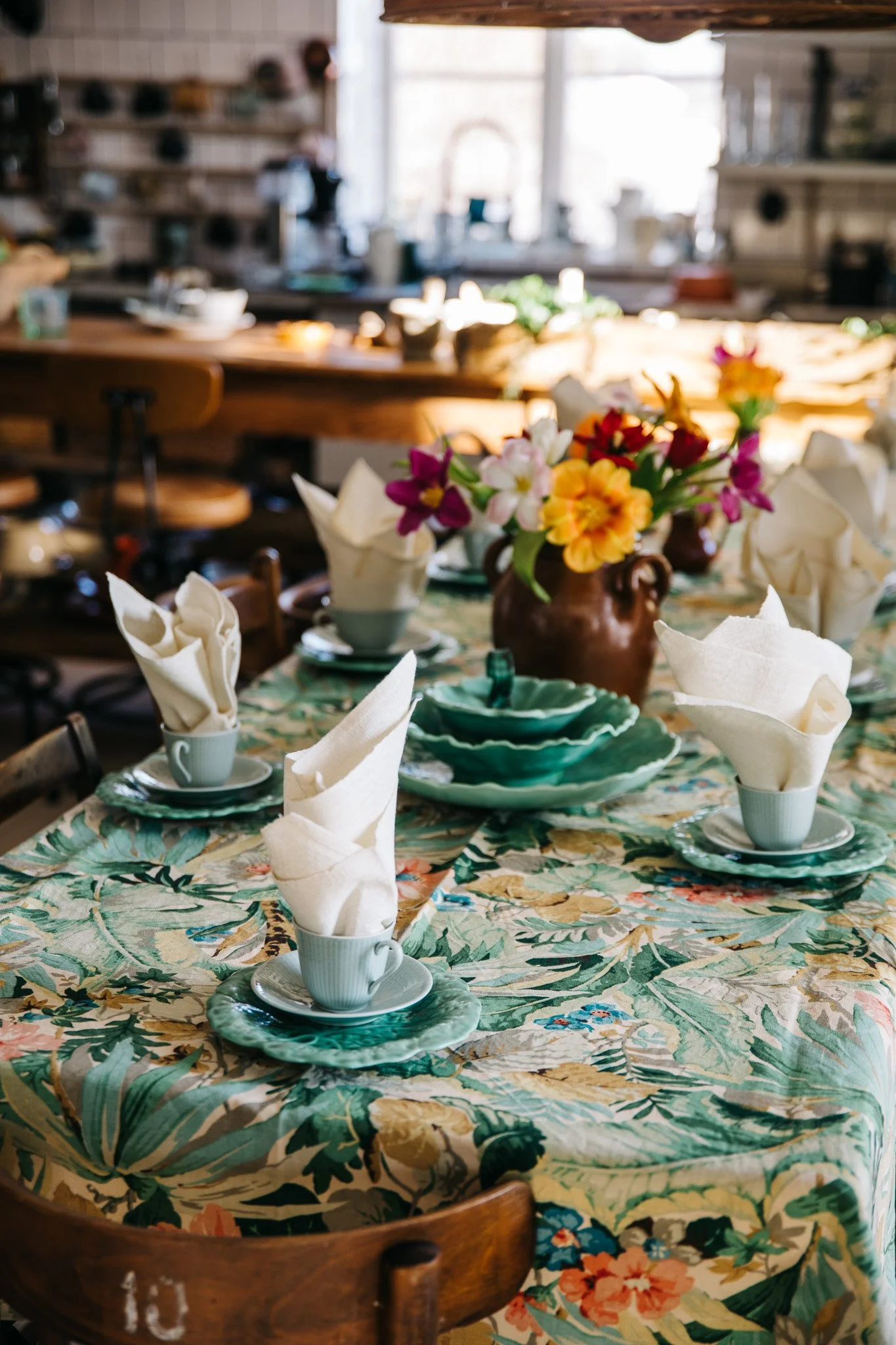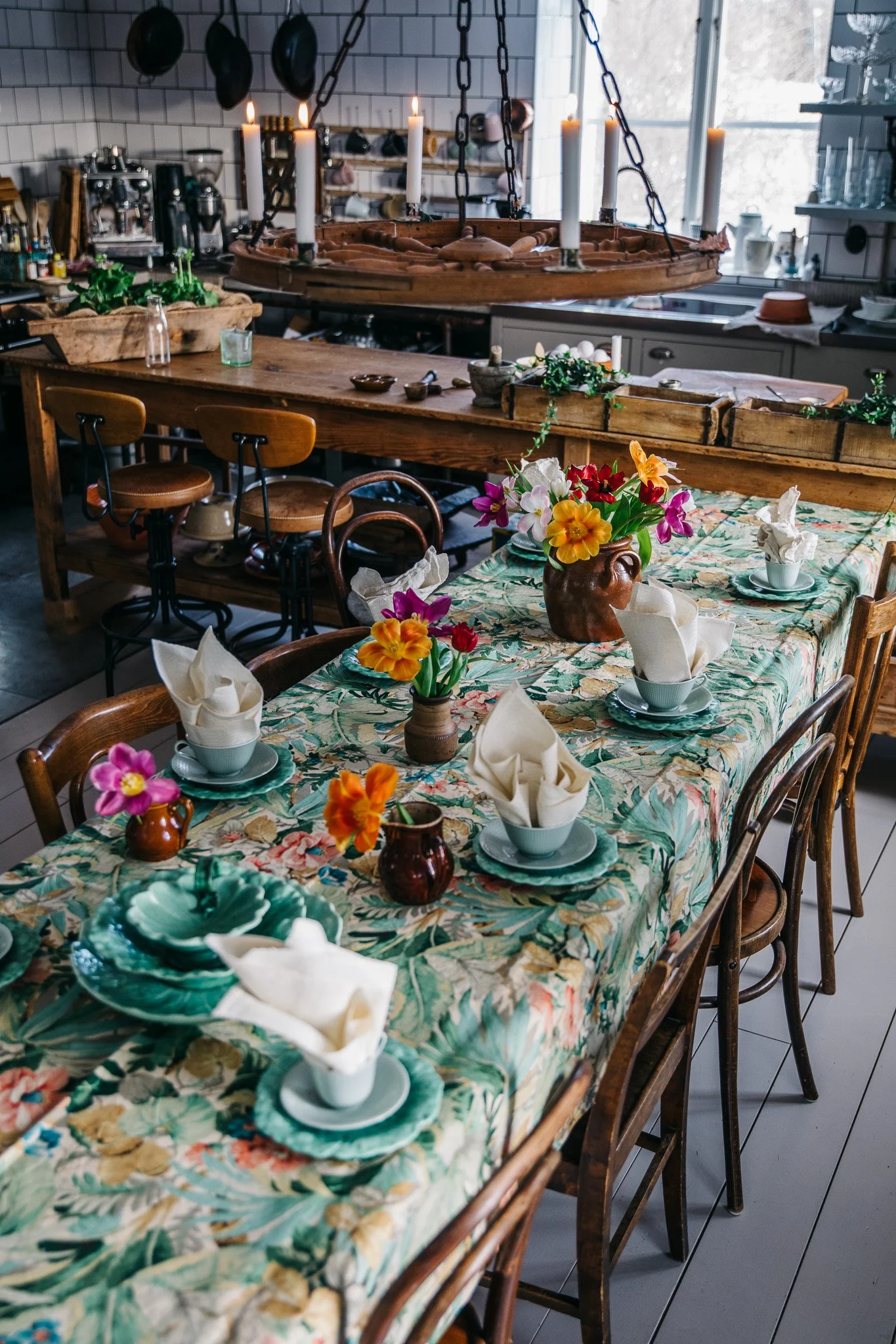 Det gröna porslinet är en mix av kaffekoppar från Rörstrands serie ”Swedish Grace” och assietterna ”Kålblad”, som är formgivna av Ruben Wallström för Gefle Porslinsfabrik på 1930-talet.