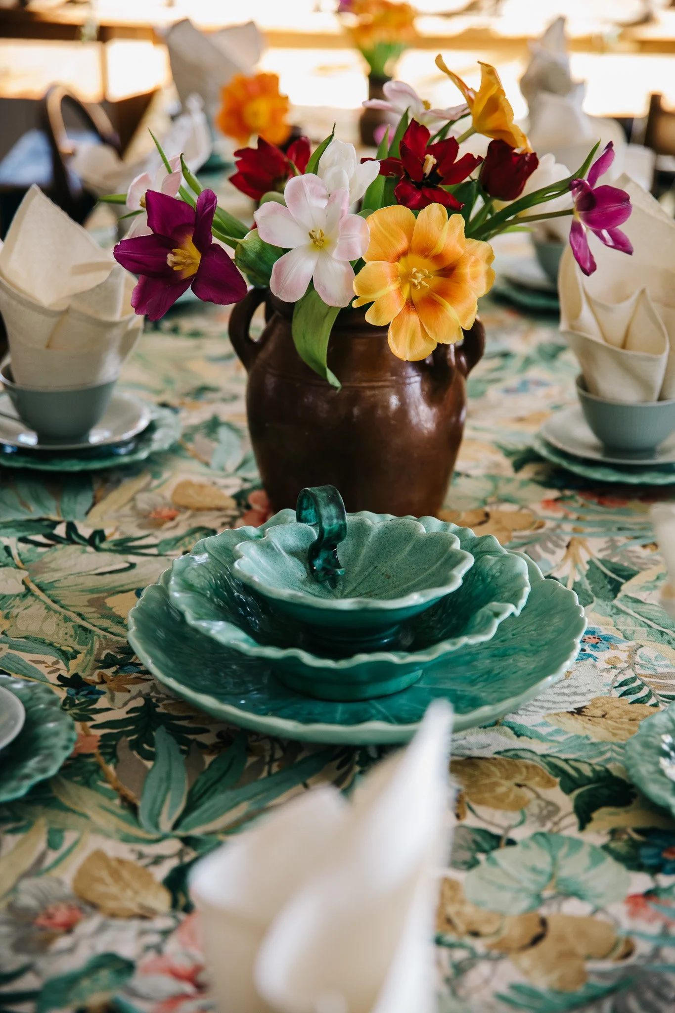 Vintageduken, som egentligen är en gardin, är köpt hos Christina på A La Carte Antikt i Stockholm. En av mina absoluta favoritbutiker när det kommer till vintageporslin och textil! (in och följ på Instagram vetja) Jag älskar kvaliteten i denna textilskatt, för att inte tala om kulörerna. SÅ fint med de olika gröna nyanserna, tillsammans med gyllenbrunt, turkosblått och laxrosa. Love it!