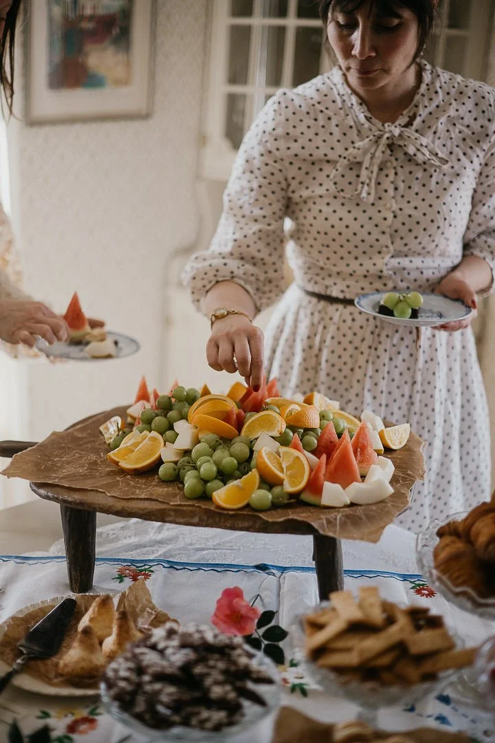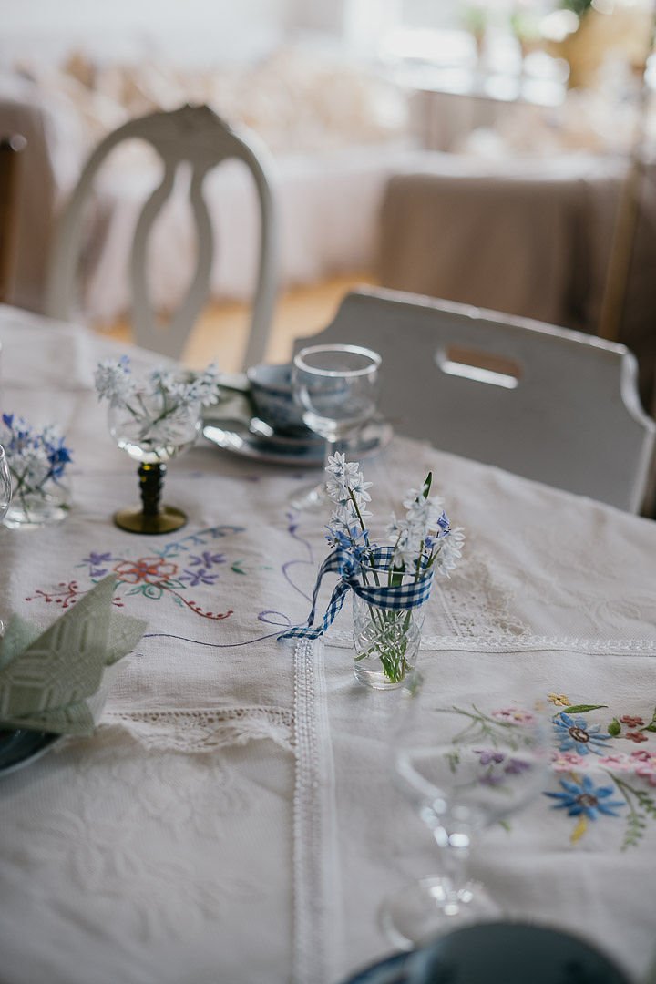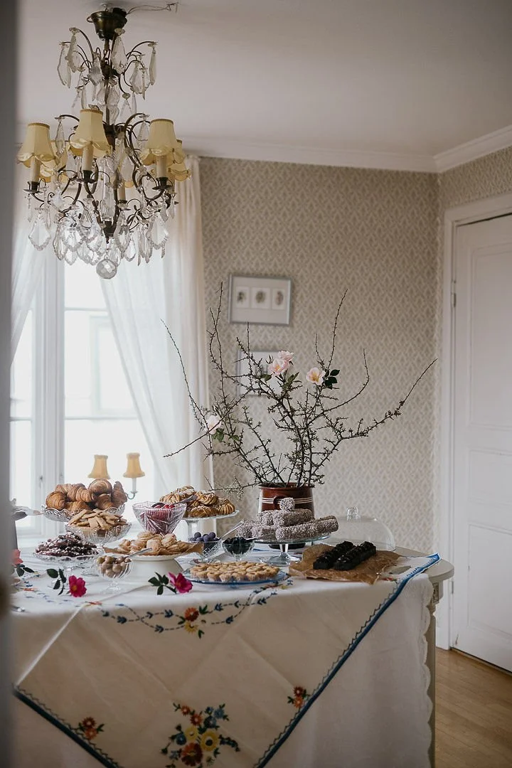 Väl framme på Stora Gatan 61 stod 11-kaffet uppdukat i ”stora salen”. Vi hade förberett det mesta dagen innan så det var bara kaffe och kakor som behövde plockas fram. Så fint att få duka upp med broderade dukskatter från secondhand och min gamla, älskade Ostindiaservis….